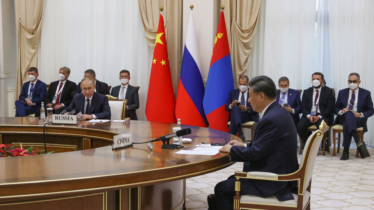 Rusland is enorm afhankelijk geworden van de yuan en dreigt een vazalstaat van China te worden, volgens Amerikaanse denktank. De Chinese president Xi Jinping en de Russische president Vladimir.
