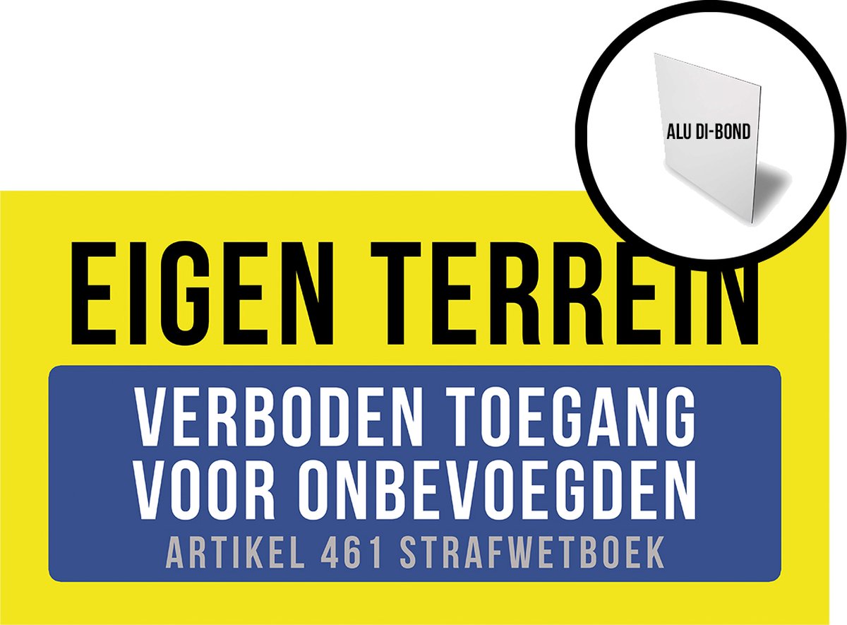 Deze handige waarschuwingsborden met Eigen terrein / verboden toegang voor onbevoegden maakt duidelijk dat het terrein een eigen terrein betreft. De borden zijn leverbaar in verschillende afmetingen. De borden worden gemaakt van dibond. Dit is een ijzersterk materiaal met een aluminium buitenlaag die wordt voorzien van een UV werende gelamineerde laag.