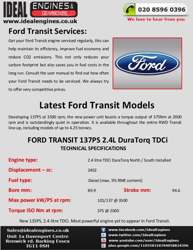 Ford Transit 2.4 Tdci Engine Specifications. Find models in which this engine was used and most common problems are compiled here. u can Download the documen.